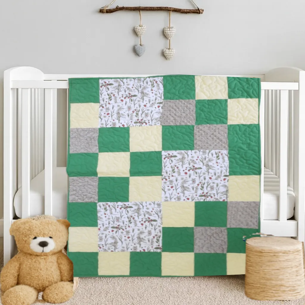The quilt includes flannel blocks with playful mice and tiny blossoms. Between them, you’ll find buttery-soft minky squares in soft yellow, light green, and gentle gray. These color tones work beautifully for both boys and girls.