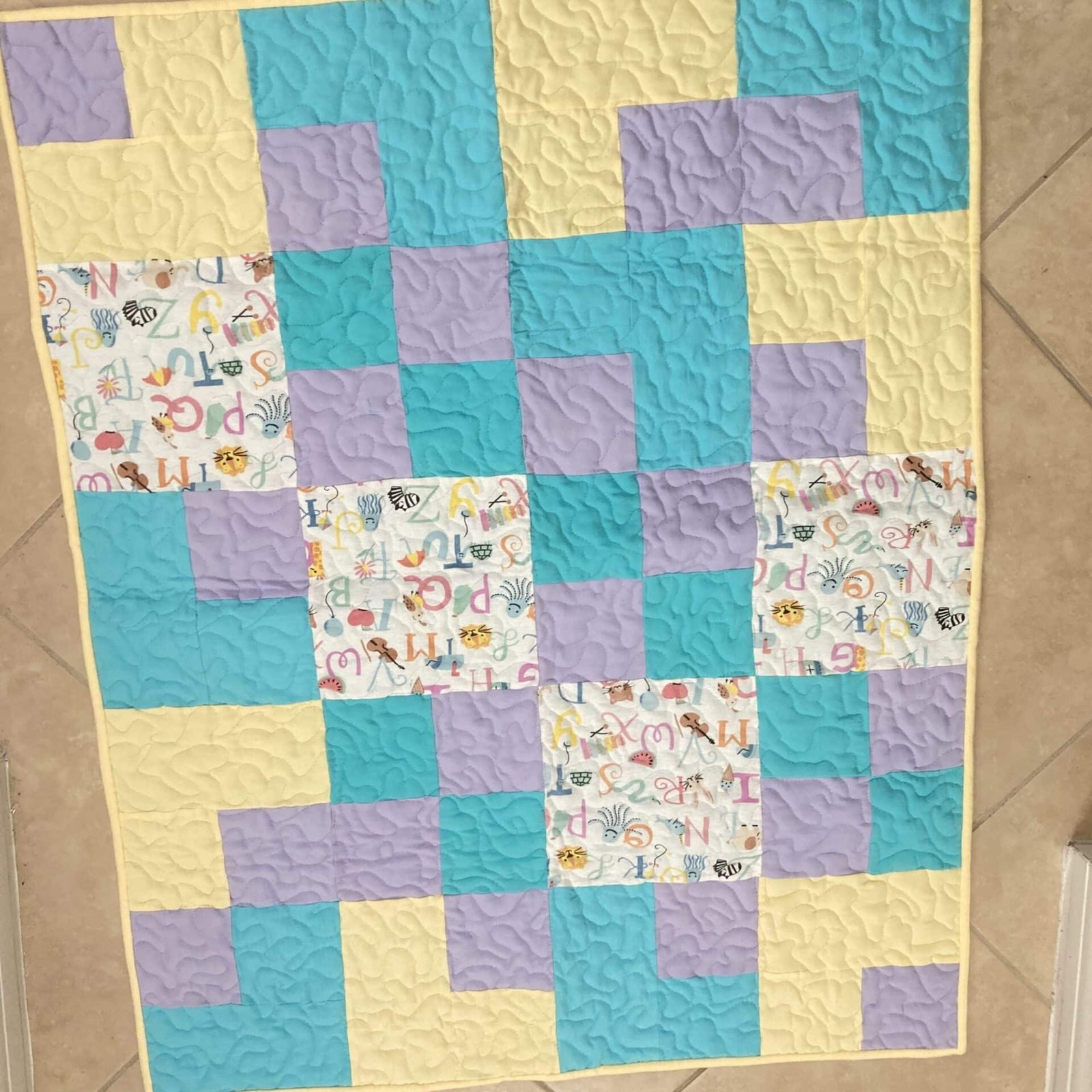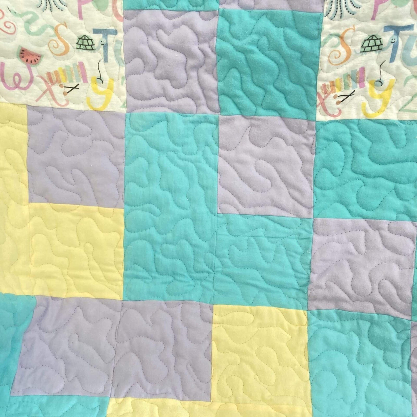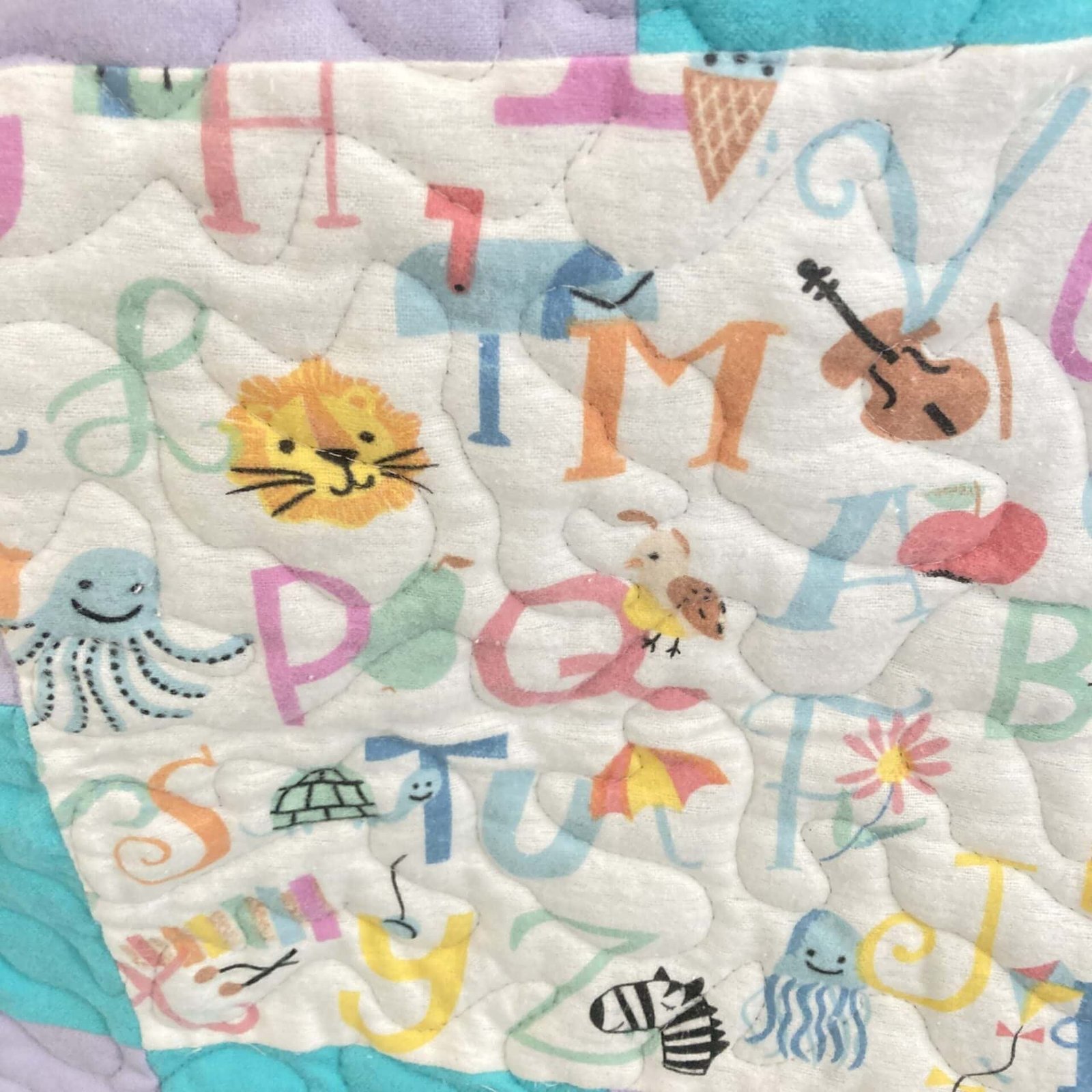 Crafted with care, the quilt features a delightful patchwork design. You’ll discover soft squares of aqua, serene lavender, and cheerful yellow flannel, each piece meticulously quilted with a swirling pattern that adds a touch of whimsy and texture. Moreover, interspersing these solid blocks are vibrant squares adorned with animal ABCs. Each letter comes to life with a cute animal illustration, fostering early recognition in an engaging way.
