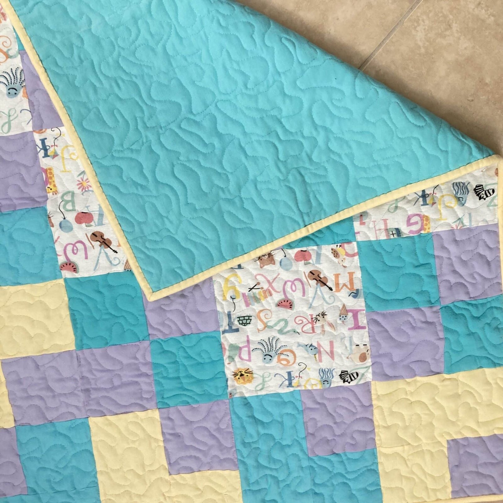 Turning the quilt over, you’ll find a solid aqua flannel backing that offers a wonderfully soft surface against delicate skin. This coordinating color beautifully complements the quilt’s front. Furthermore, a sunny yellow flannel binding neatly finishes the edges, providing a durable and attractive border.