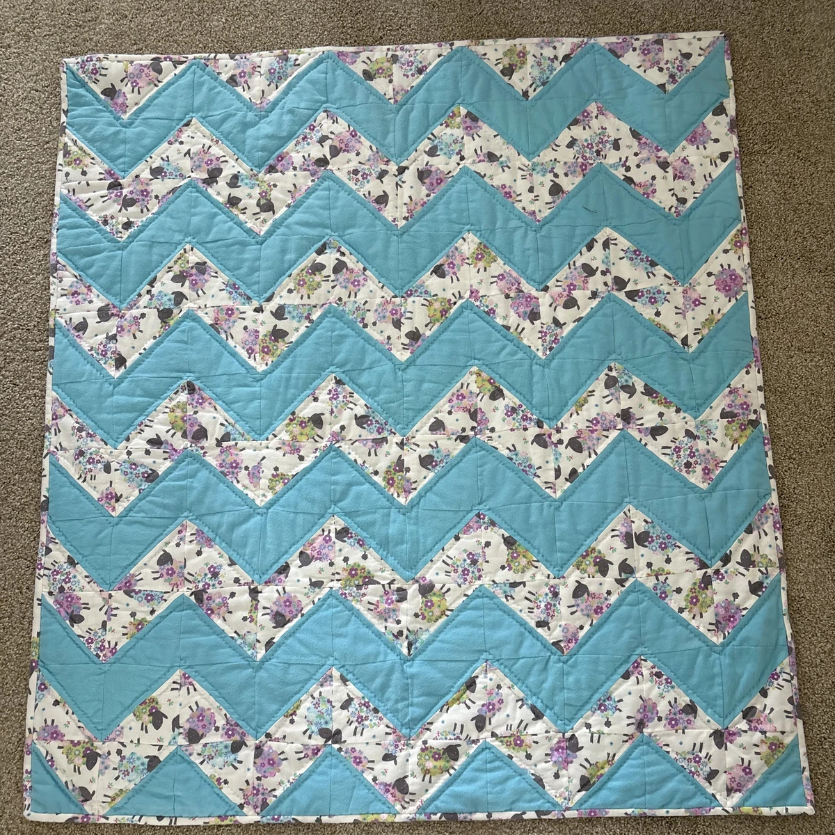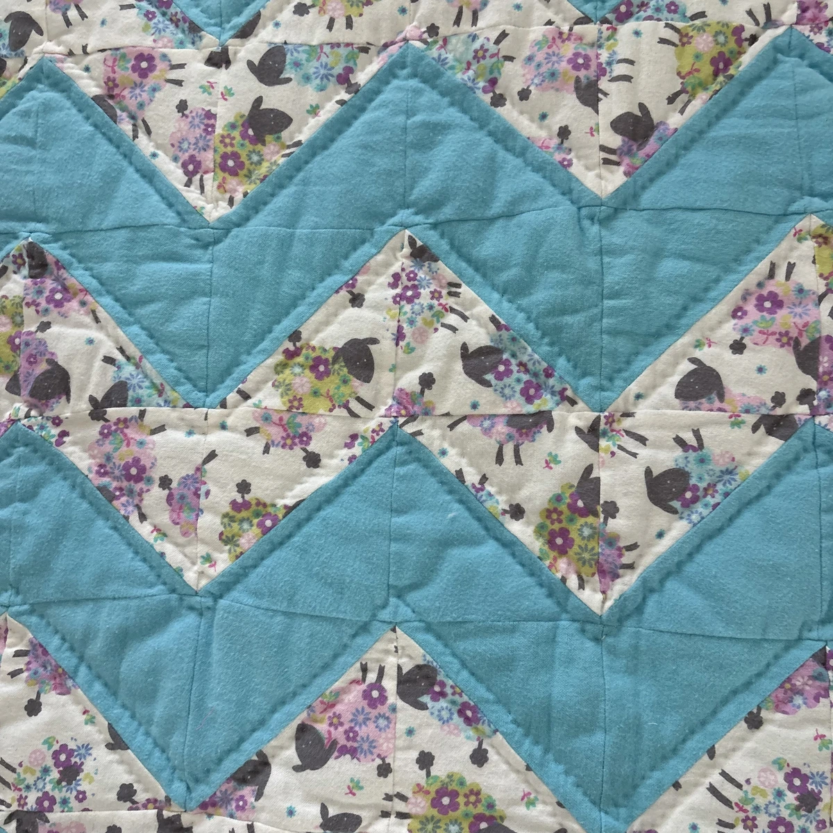 & Free ShippingBaa Baa Baby Sheep Quilt features little lambs on a cotton flannel print in a chevron pattern of blue and white with just a hint of pink.
