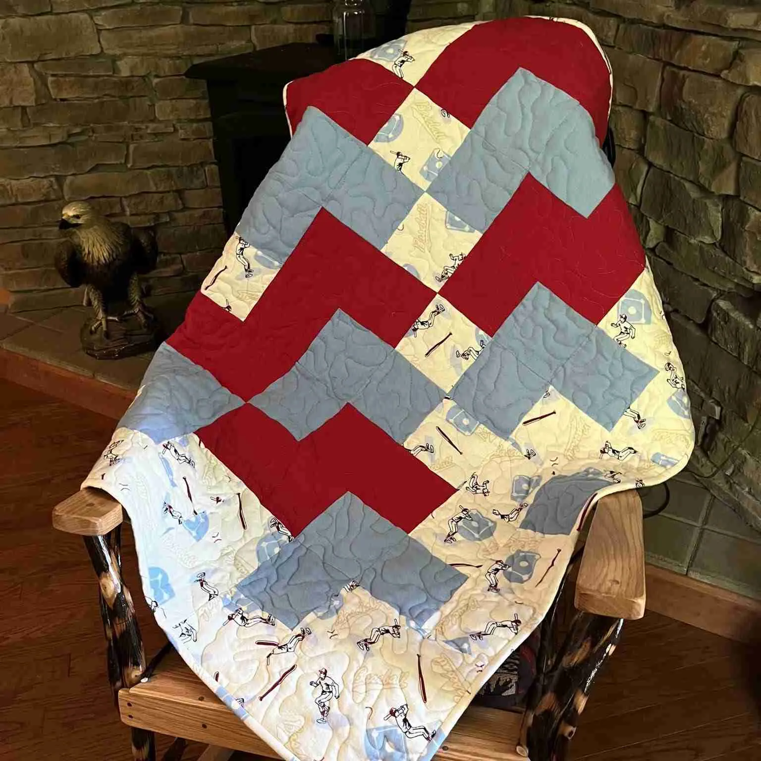 This quilt features a batter ready to swing, surrounded by vibrant red and light blue patches. The timeless design evokes the joy of summer ball games and the thrill of cheering for the home team. It’s a perfect gift for any baseball-loving family.