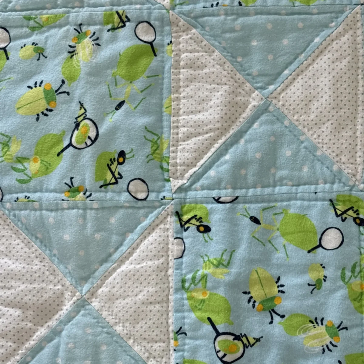 One special feature of this bugs quilt is its reversible design. The back uses the same blue and white polka dot fabric as the front. Simply flip it over for a fresh, new look in the nursery!