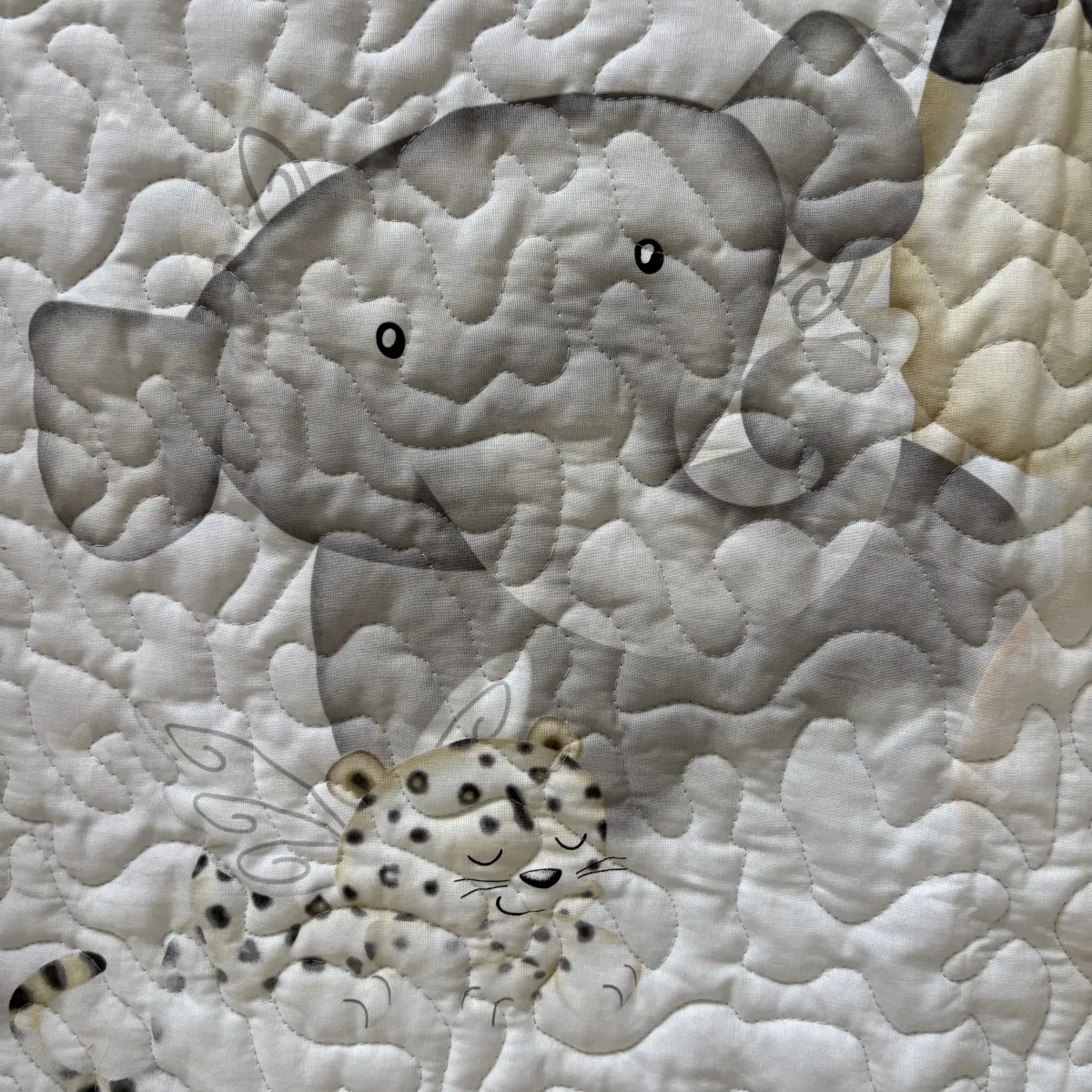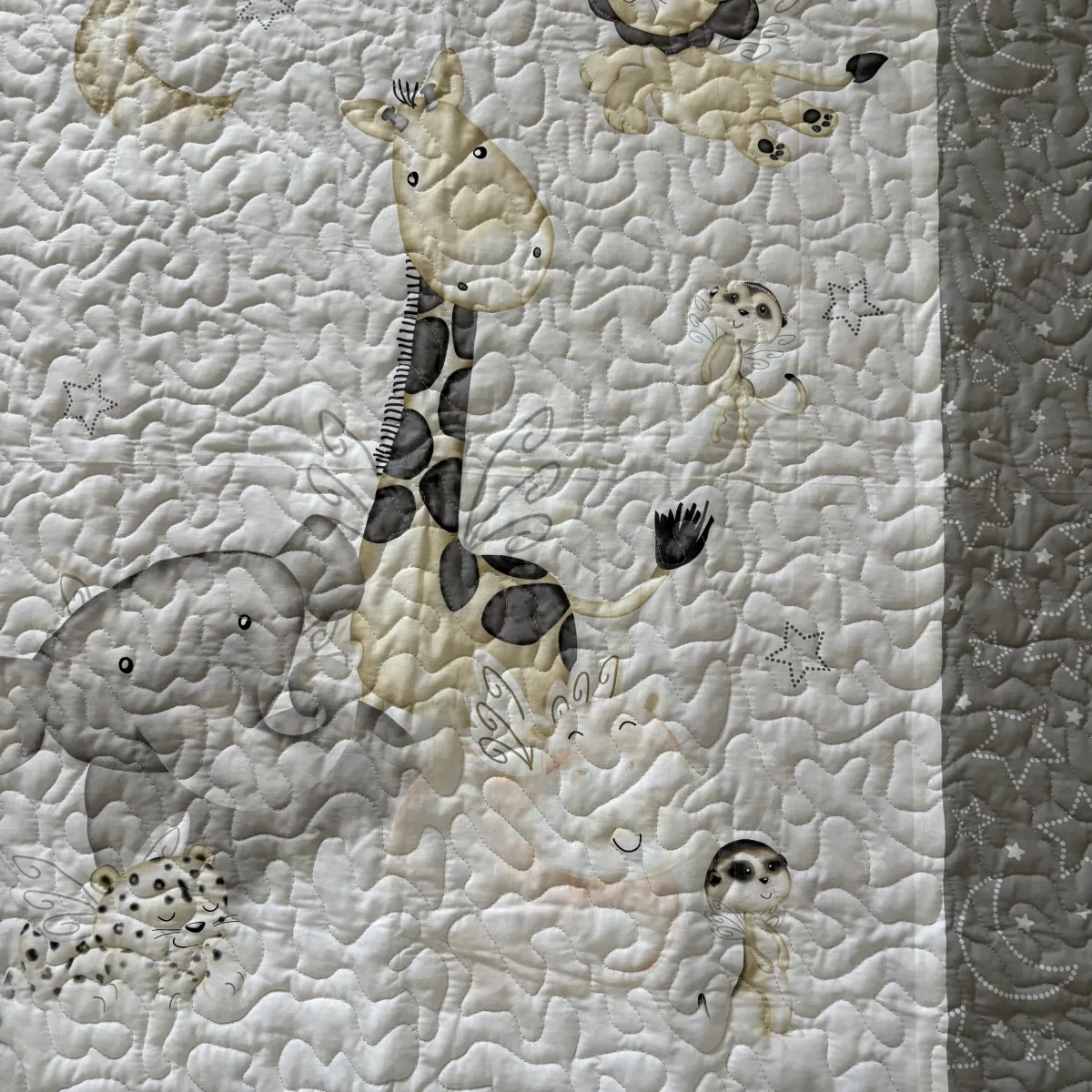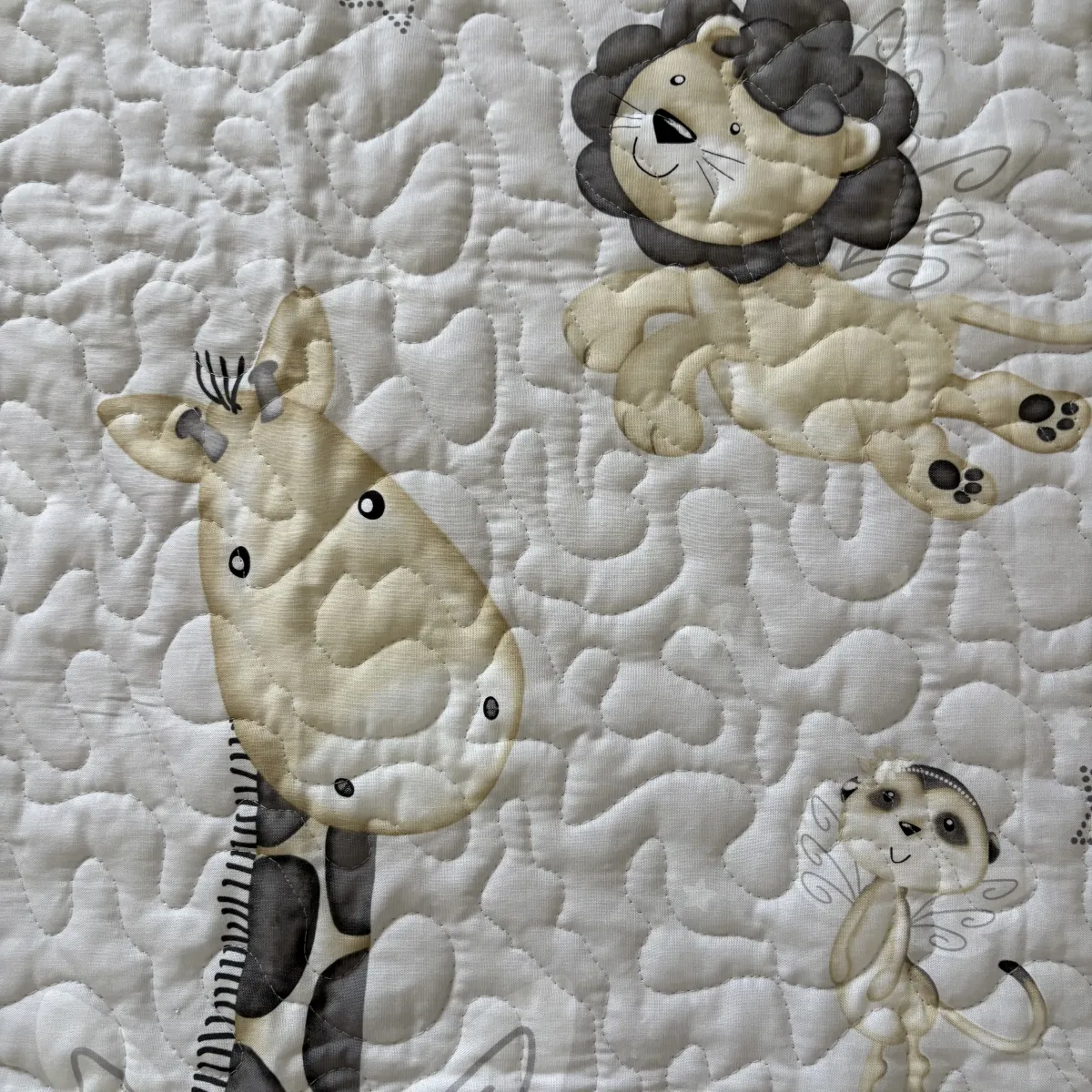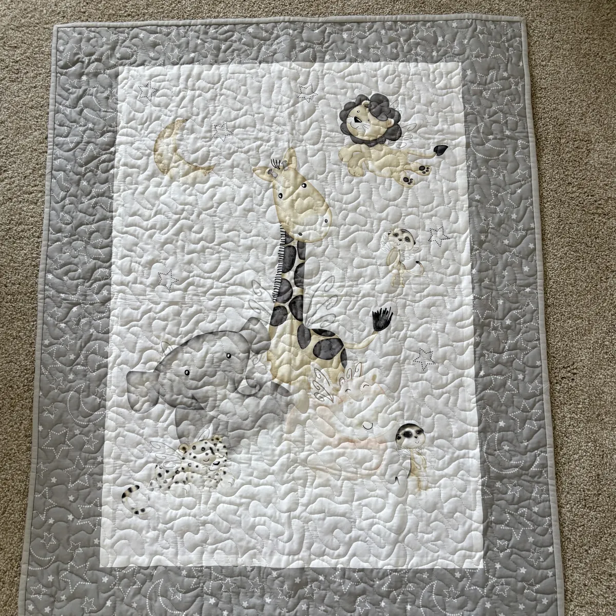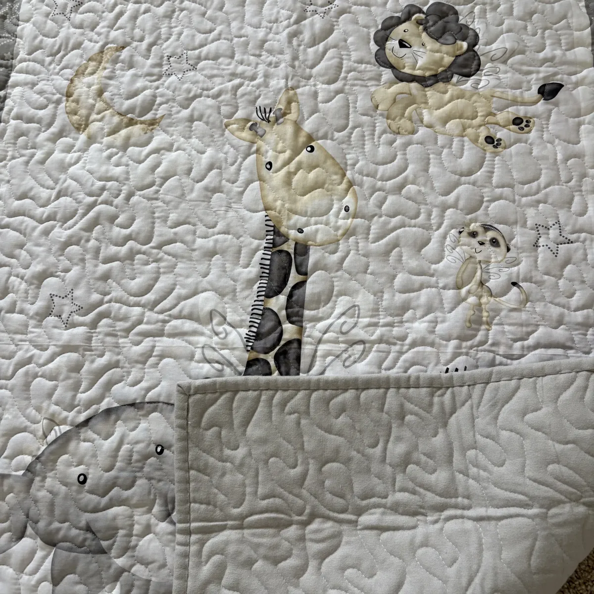 The center panel features friendly jungle animals—giraffes, elephants, and lions—resting beneath a moonlit sky. Soft gray clouds and a glowing yellow moon add a calming nighttime touch. With its peaceful palette, this quilt brings a dreamy safari scene to any baby’s space.