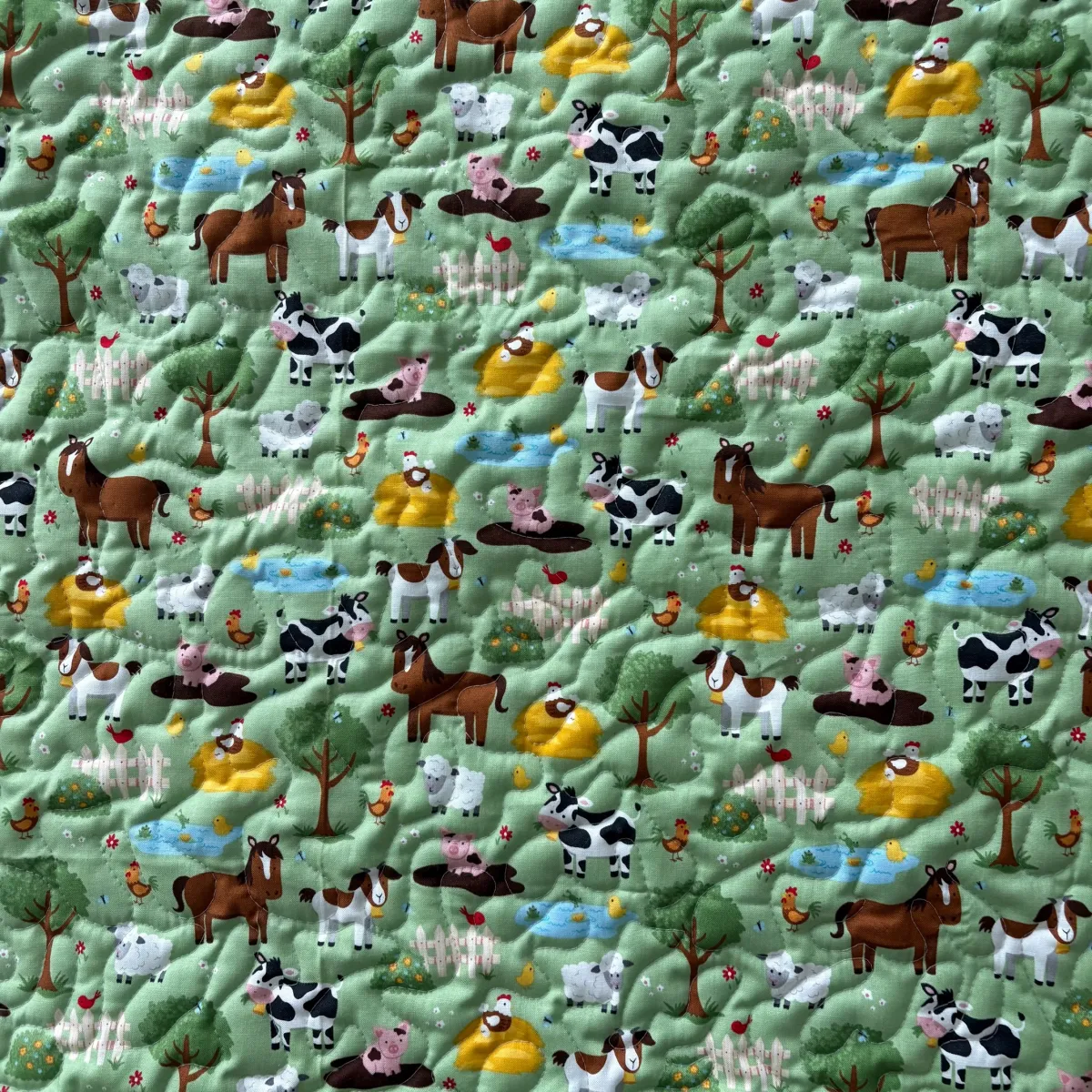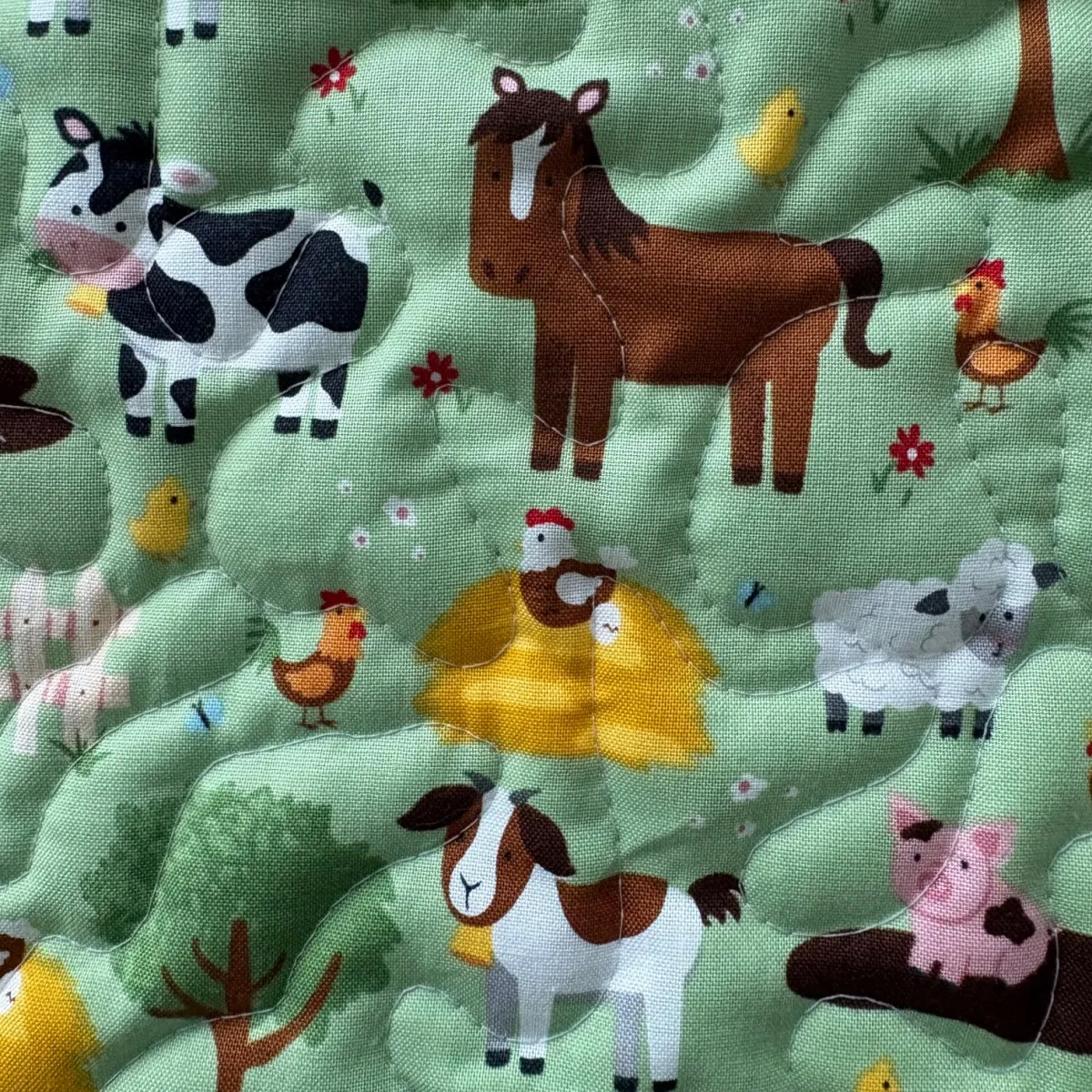 Notice the soft flannel and gentle stitching on the Farm Animal Friends Playmat.