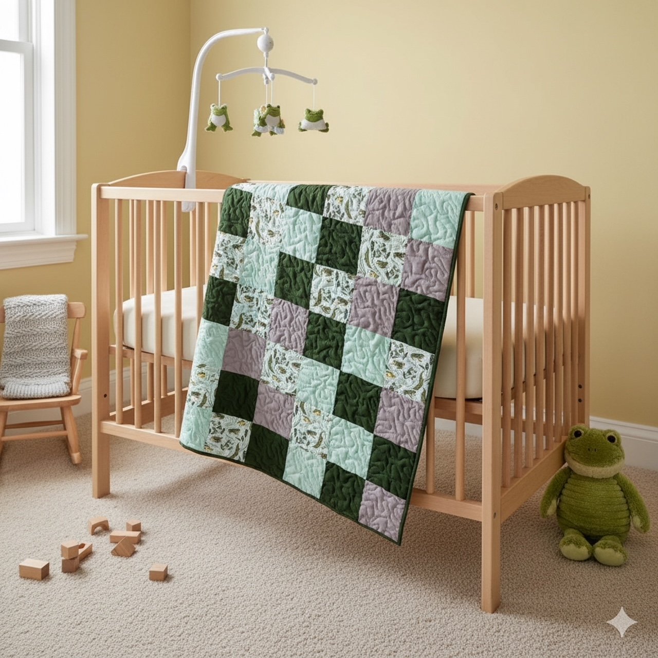 This handcrafted baby quilt brings the forest to life with soft lavender, light blue, and deep green squares. A whimsical print featuring frogs, birds, and leafy ferns adds playful personality and gentle storytelling to your nursery.