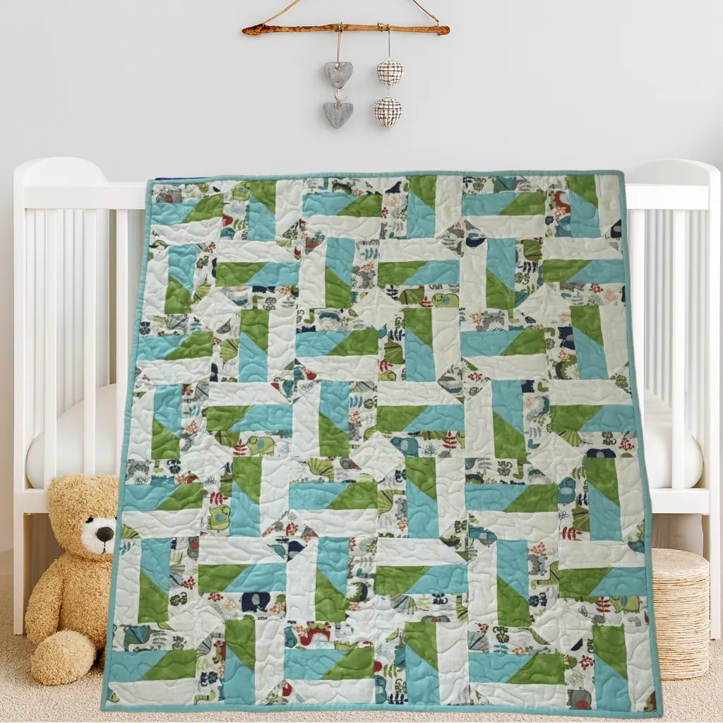 Designed to complement any nursery, this quilt features a soothing color palette of green, blue,and white. The playful dinosaur pattern brings a sense of adventure while maintaining a soft, calming look.