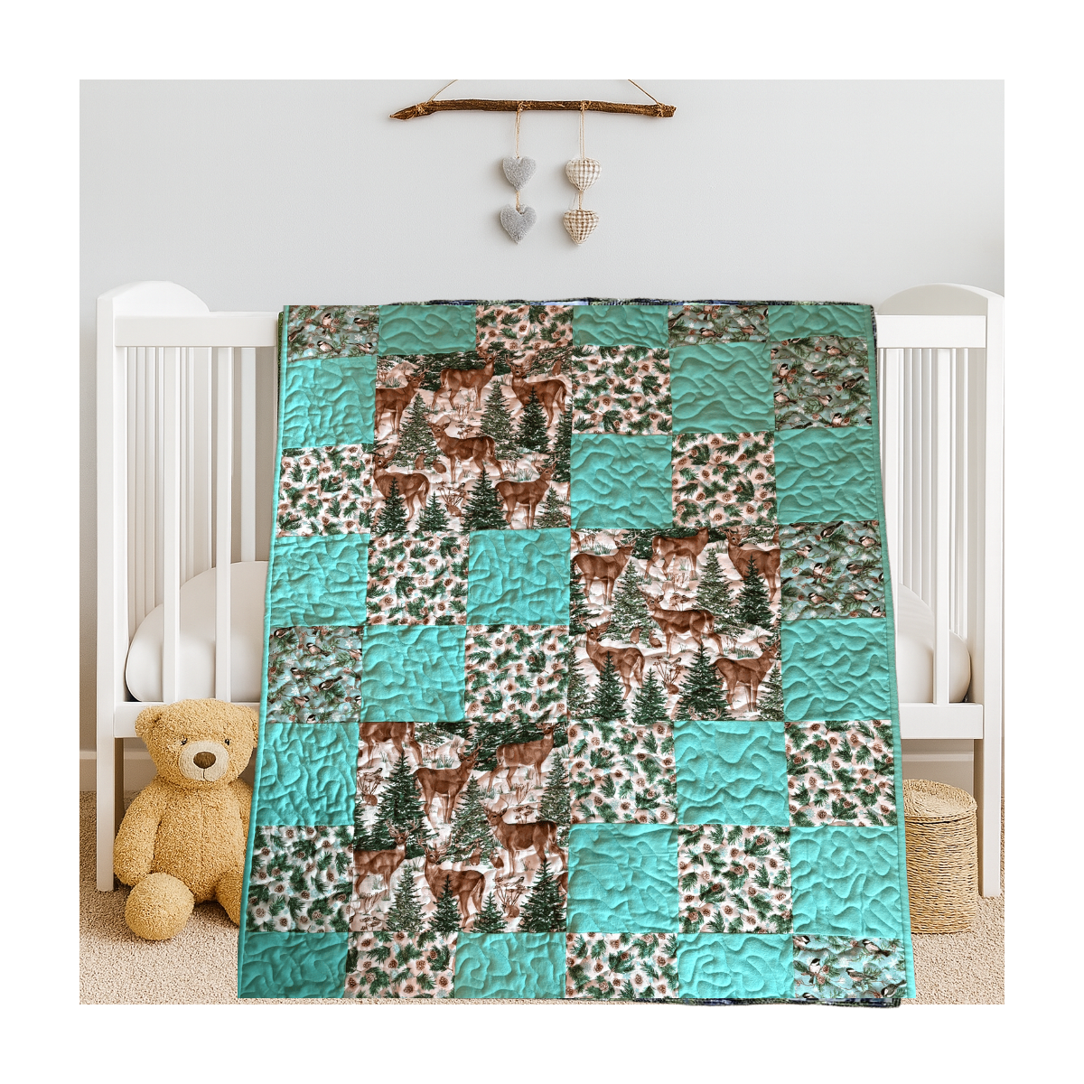 Bring the quiet beauty of winter into the nursery with this cozy, nature-inspired baby quilt. The Winter Woodland Whimsy Baby Quilt features gentle deer, curious chickadees, and scattered acorns nestled among soft aqua flannel blocks. It’s the perfect mix of comfort and charm—thoughtfully made for sweet winter moments.